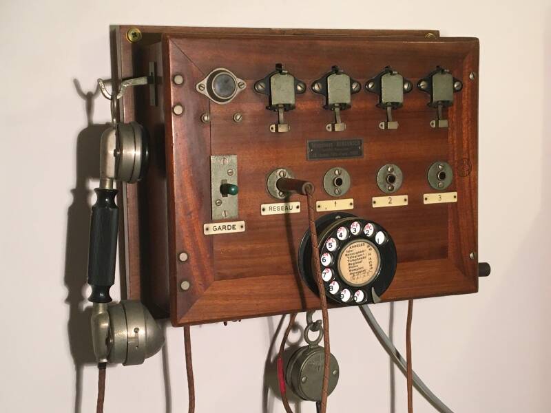 The French company Burgunder produced this small corded switchboard around 1938. It has one external line (marked Reseau which stands for network) and 3 internal lines. A metal flap drops when a call comes in. A switch can be set to then also ring a buzzer if required. The switchboard has a handset and a dial. A magneto generator can be used to ring an internal line. The metal indicator flap has to be reset manually after the call. The switchboard requires a 12V battery for internal operation.