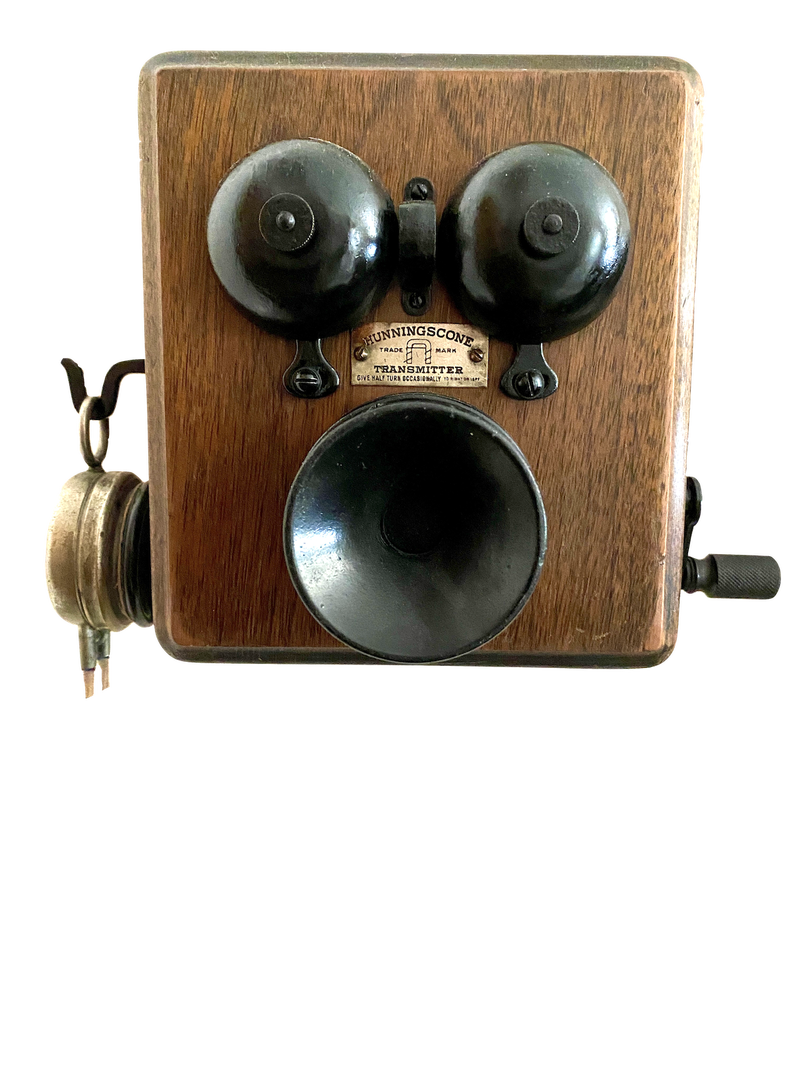 I have a few early telephones, equipped with a Hunningscone transmitter, probably made by Peel-Conner around 1900. Two of them have a magneto generator and AC bells, as they were used with manual switchboards. The third one was used in intercom systems. It uses a local 12V battery and a push button to activate the remote DC buzzer.